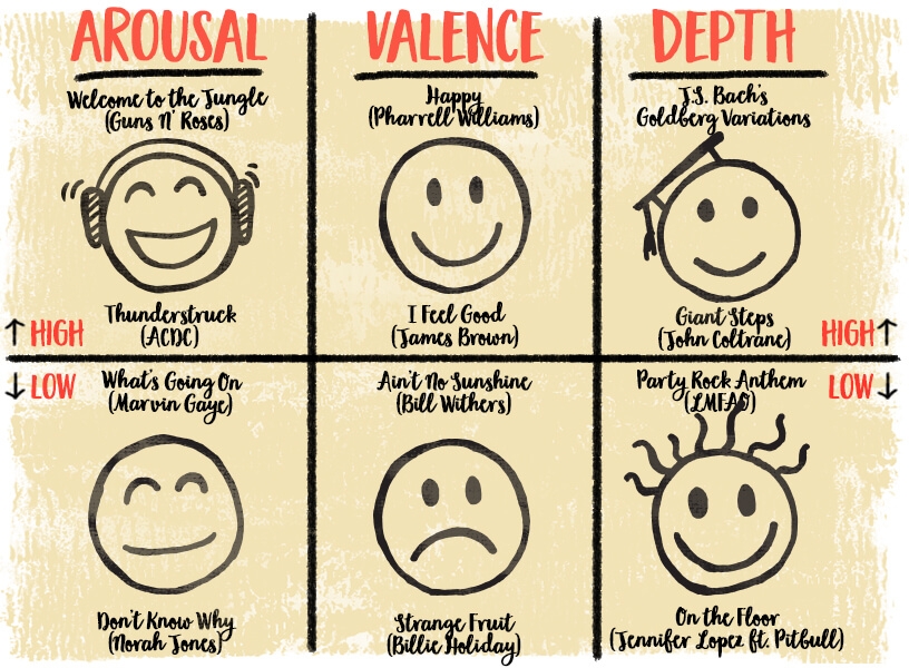 The scientists developed a common language to discern the link between melody and mood. The team asked 76 “judges” with no formal musical training to rate over 100 little-known musical samples from 26 different genres. A statistical analysis of the judges' opinions revealed that the differences between this diverse set of musical samples could be reduced to three main dimensions: arousal, valence, and depth. Take Joni Mitchell's “Blue” as an example. The song is considered low on arousal with its slow tempo and soft vocals, it has a negative valence because of its sad lyrics, and it rates high on depth because of the complex emotion conveyed by the harmony and Mitchell's expressiveness.