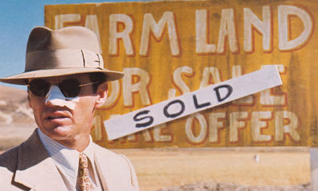 Chinatown The movie captures the city in a summer heatwave: the blinding exteriors dazzle the eye and blur the judgment; shafts of light create a sinister atmosphere as they penetrate the dark interiors through venetian blinds. Jerry Goldsmith's superb score uses strings and percussion during moments of suspense and a distant, and bluesy trumpet for elegiac, contemplative scenes. Above all there is Nicholson's Gittes, a cocky, confident operator losing his social moorings and ending up as the proverbial drowning man reaching out for straws. |